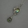 Oryginalny naszyjnik z dużą (3cm) kroplą jadeitu miętowego. Wykonany ręcznie techniką wire wrapping z dbałością o każdy szczegół. W całości ze stali chirurgicznej. W element ozdobny wplecione zostały małe kuleczki jadeitu. Całkowita długość naszyjnika regulowana 46,5-52,5cm. Jadeit jest talizmanem przynoszącym szczęście, dobrobyt i udane małżeństwo....