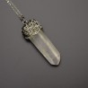 Ręcznie wykonany wisiorek z kolekcji Talizmany z kryształem górskim z naturalnym szpicem. Kryształ pokryty został warstwą tytanu. Wisiorek zrobiony został ręcznie techniką wire wrapping z drutów ze stali chirurgicznej. Całkowita długość wisiorka ( z kółeczkiem) 4,1 cm. Sam kamień ma wymiary 3,1x0,8x0,7 cm. Zawieszony został na łańcuszku ze stali...