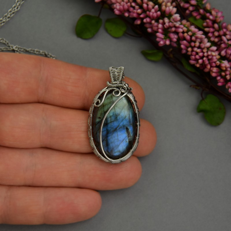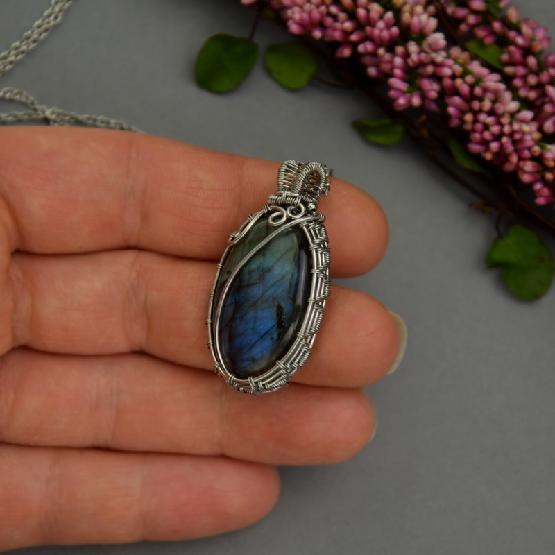 Ręcznie robiony wisiorek z pięknym, połyskującym na niebiesko i zielonkawo labradorytem. Wykonany ręcznie techniką wire wrapping z drutów ze stali chirurgicznej.