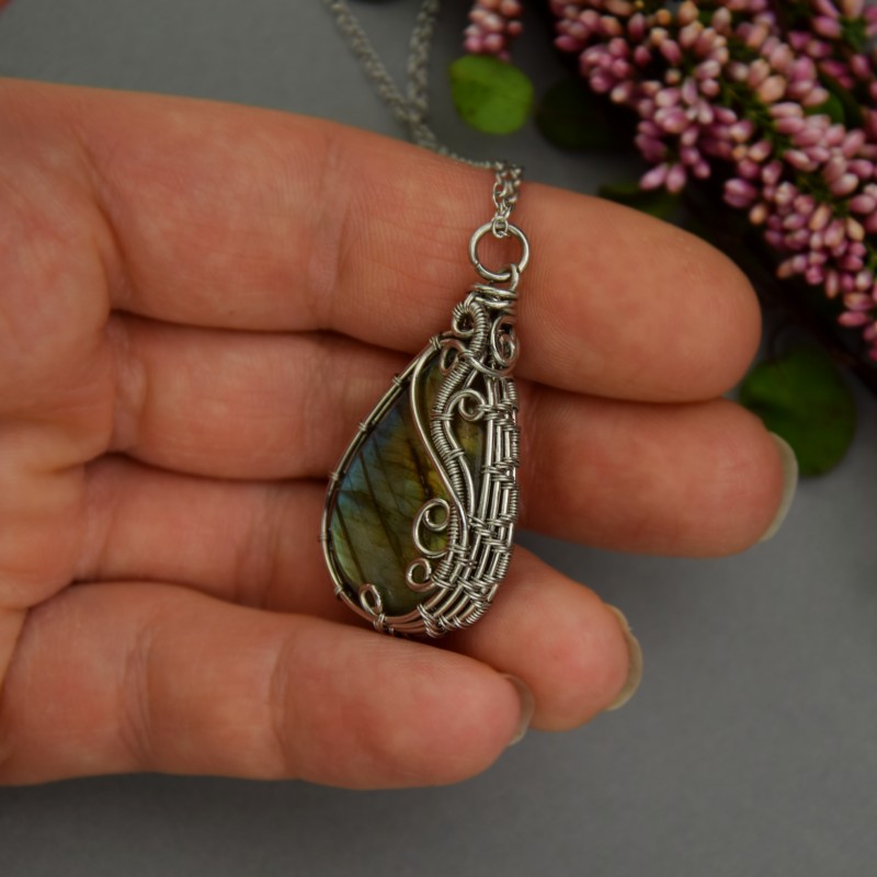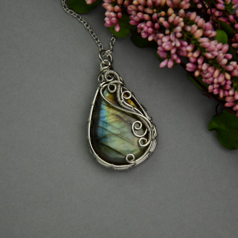 Ręcznie robiony wisiorek ze ślicznym, unikatowym labradorytem. Wykonałam go techniką wire wrapping z drutów ze stali chirurgicznej.