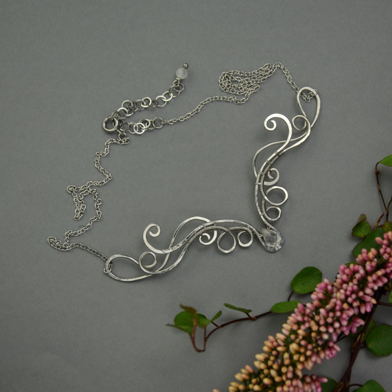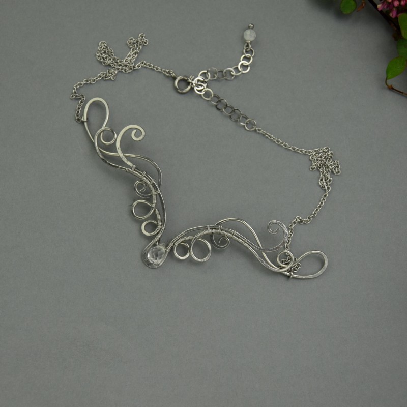 Oryginalny naszyjnik z kroplą kryształu górskiego. Wykonany przeze mnie ręcznie techniką wire wrapping z drutów ze stali chirurgicznej. Druty zostały [przeze mnie częściowo spłaszczone, ręcznie za pomocą młotka.
