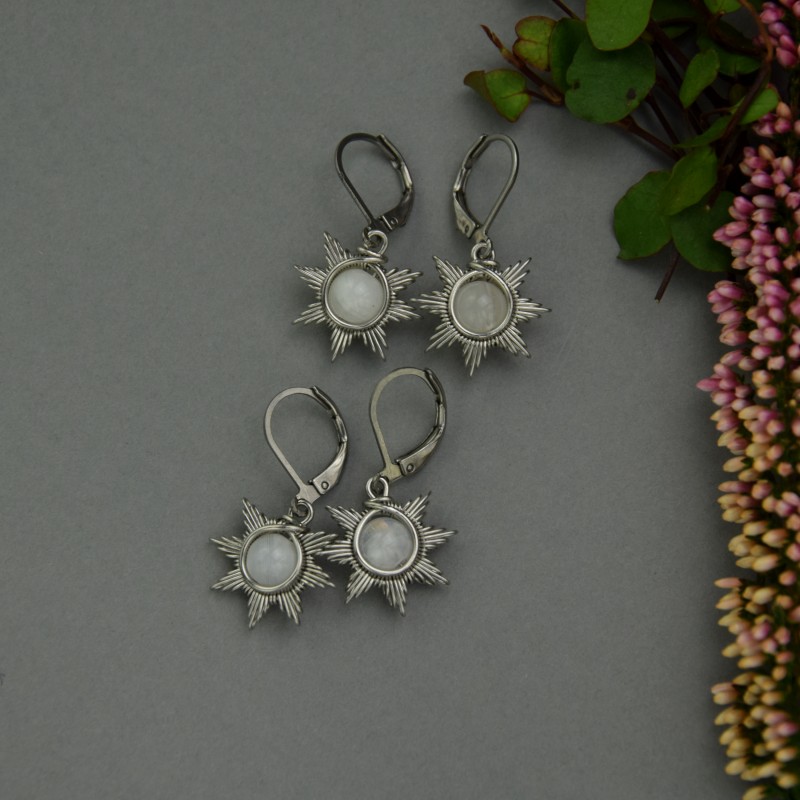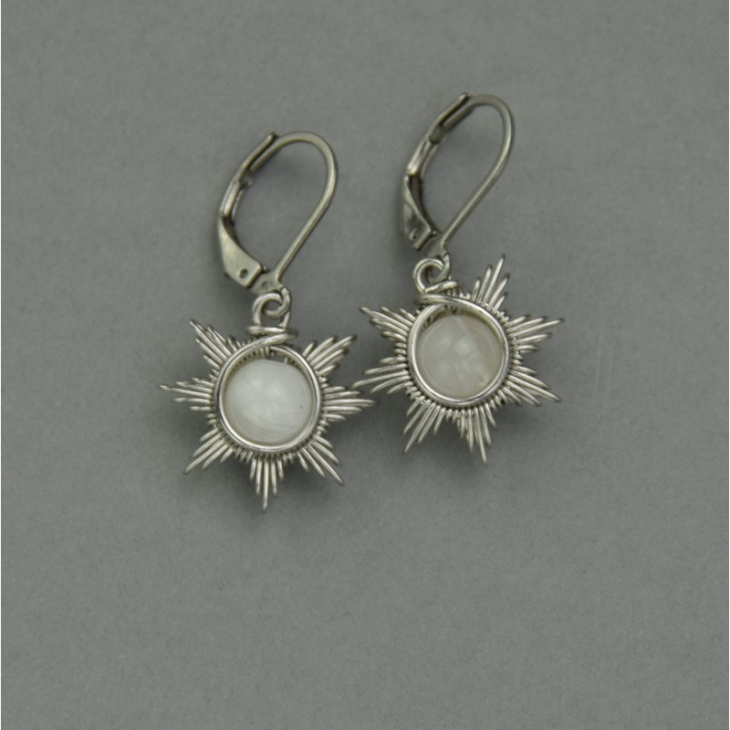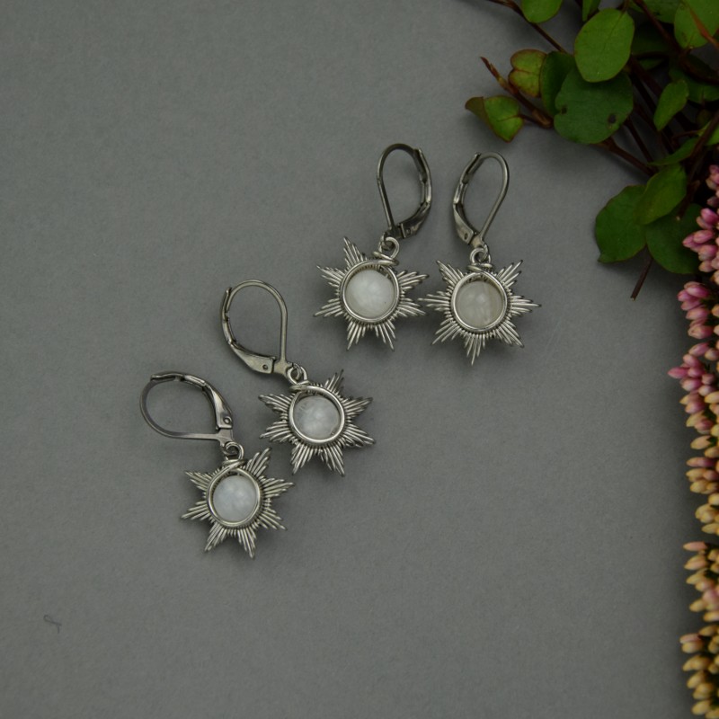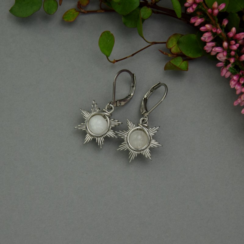 Małe, ręcznie zrobione kolczyki w kształcie słoneczek z kamieniami księżycowymi. Wykonane z drutów ze stali chirurgicznej techniką wire wrapping.