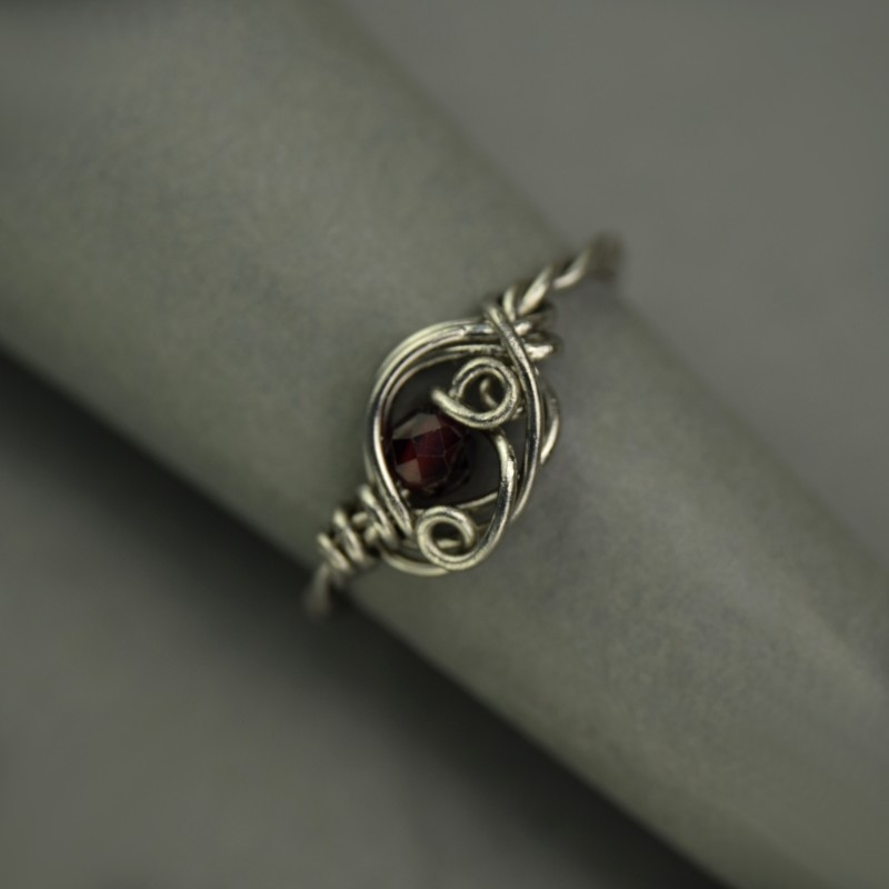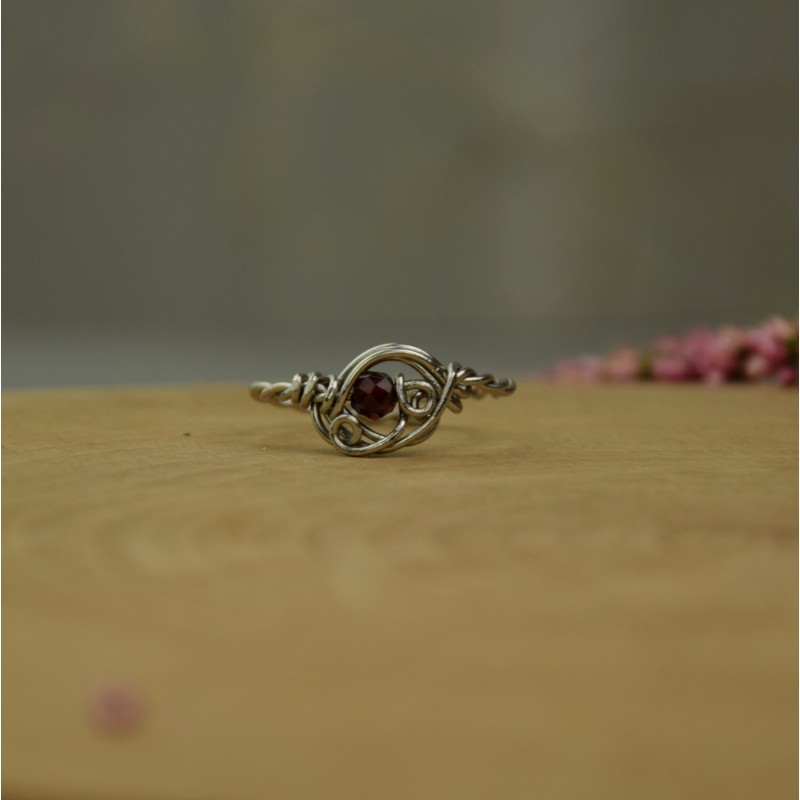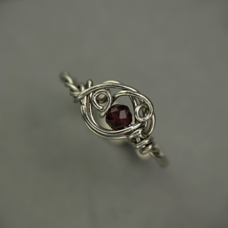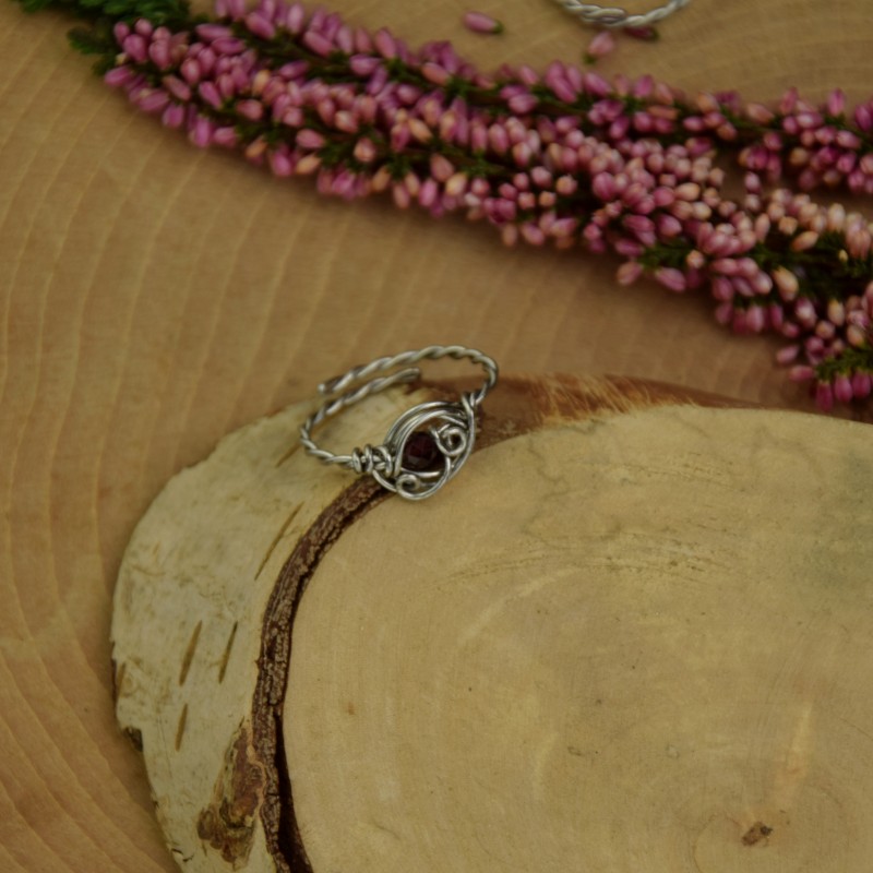 Unikatowy, ręcznie zrobiony pierścionek z naturalnym granatem, wykonany techniką wire wrapping z drutów ze stali chirurgicznej.