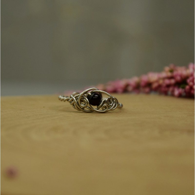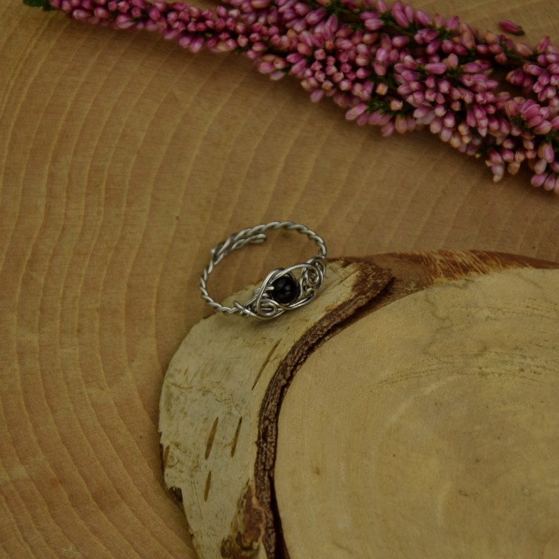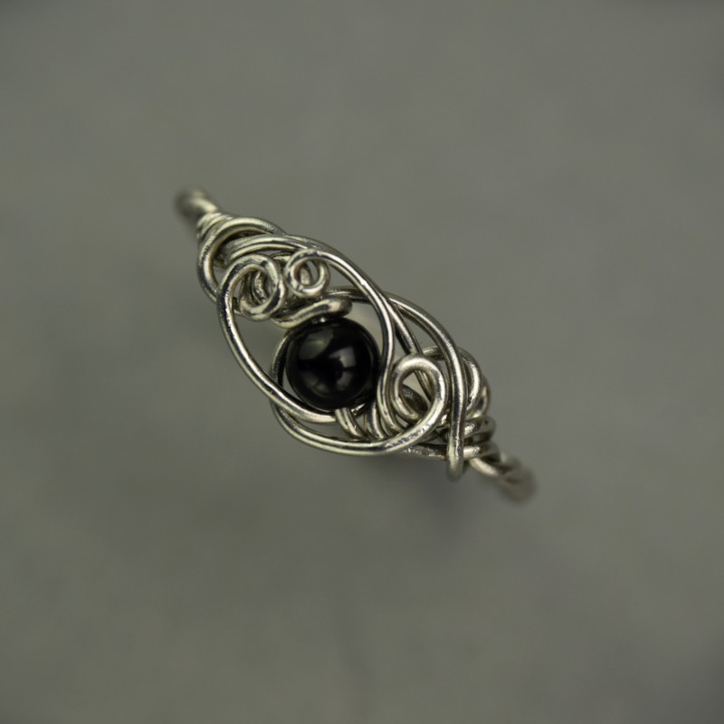 Ręcznie robiony pierścionek z kulką czarnego onyksu, wykonany ręcznie z drutów ze stali chirurgicznej techniką wire wrapping.