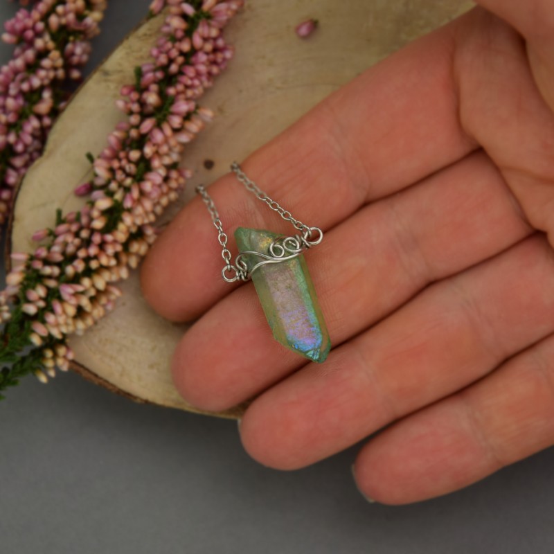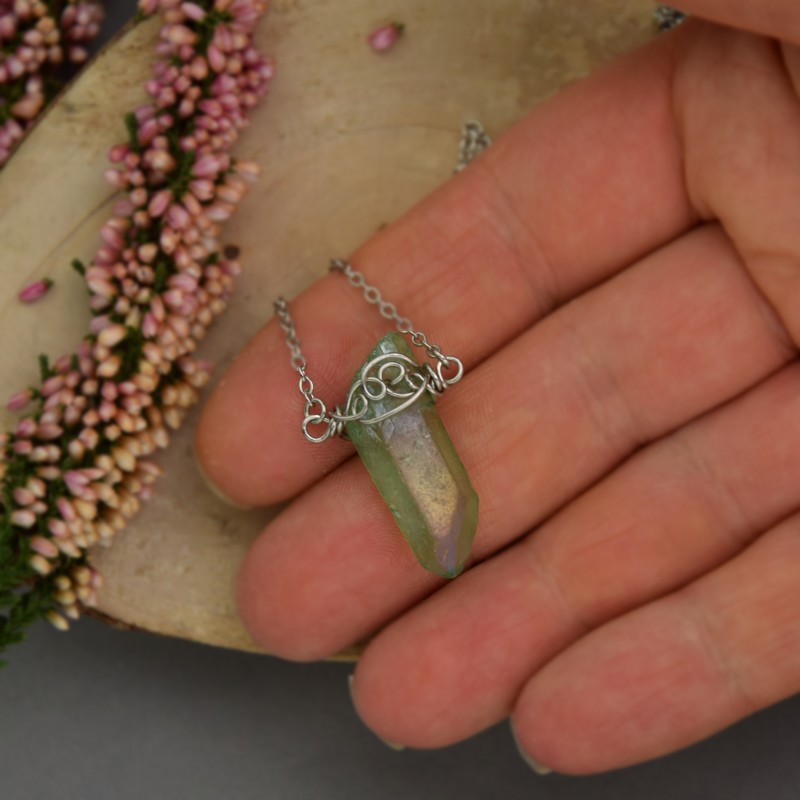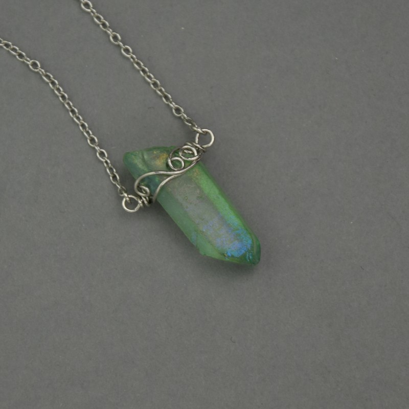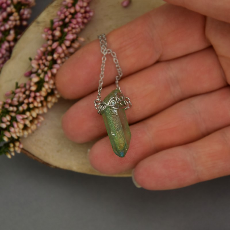 Naszyjnik z kolekcji Talizmany w wersji minimalistycznej z zielonym, połyskującym delikatnie na kolorowo kryształem górskim w formie surowego sopla z naturalnym szpicem.
