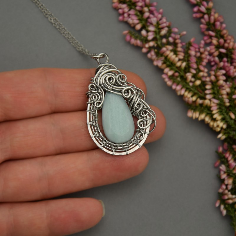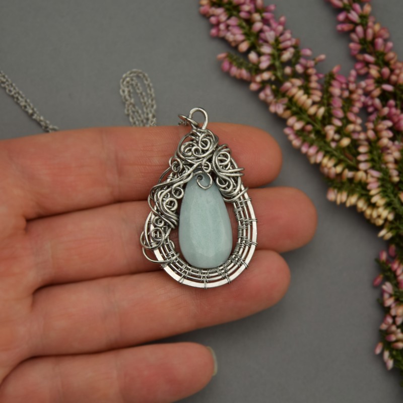 Oryginalny, duży wisiorek z amazonitem. Wykonany przeze mnie ręcznie techniką wire wrapping z drutów ze stali chirurgicznej. Część drutów została przeze mnie spłaszczona za pomocą młotka.