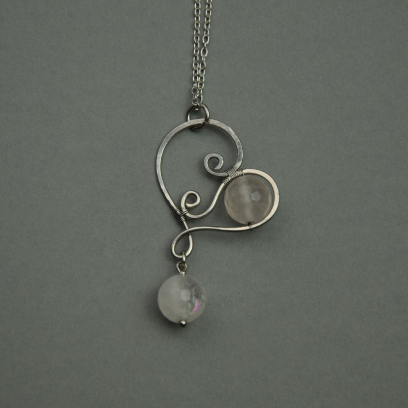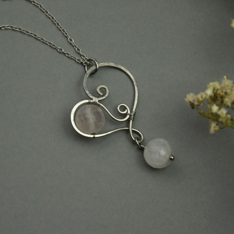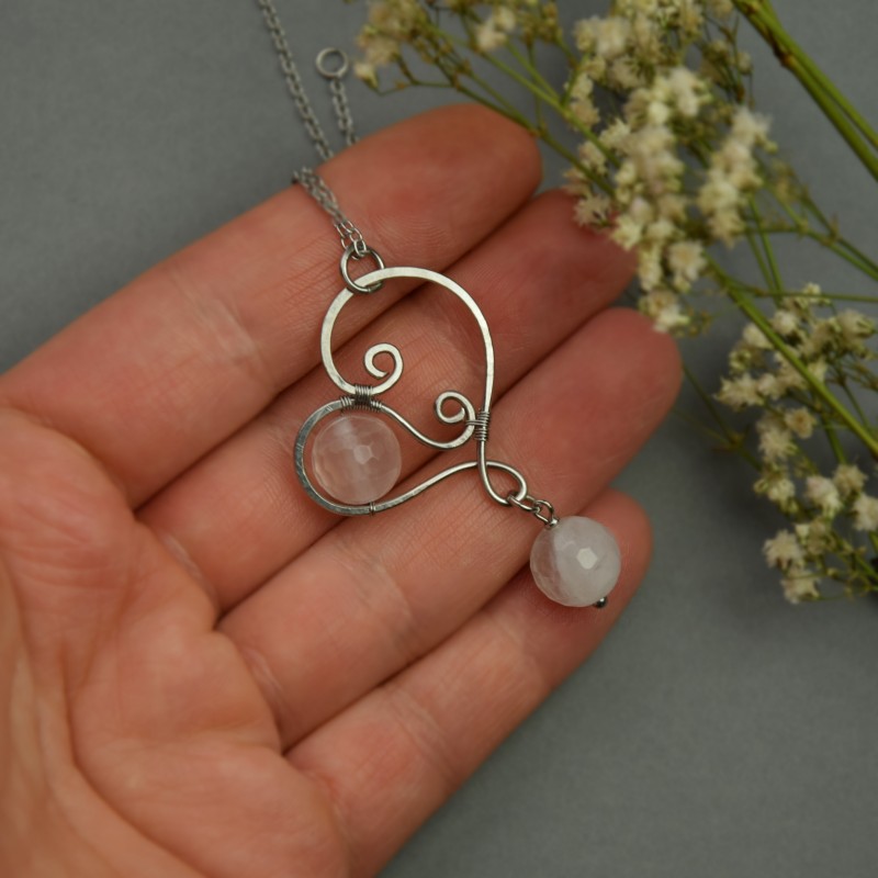 Oryginalny i unikatowy wisiorek serce z kwarcem różowym. Serce zrobiłam techniką wire wrapping z drutów ze stali chirurgicznej. Druty zostały przeze mnie częściowo spłaszczone przy użyciu młotka.