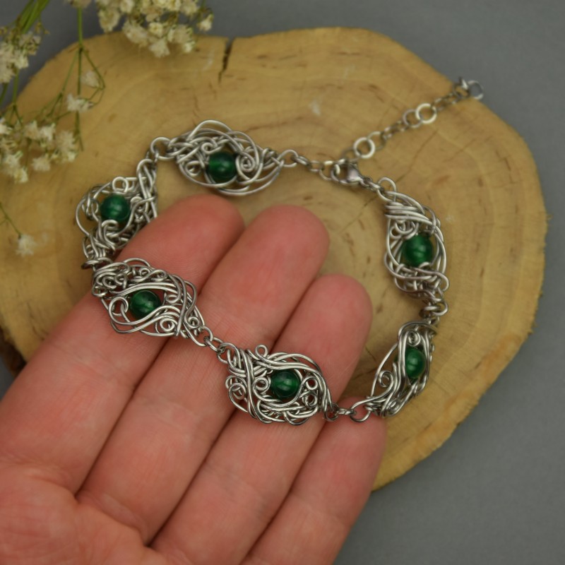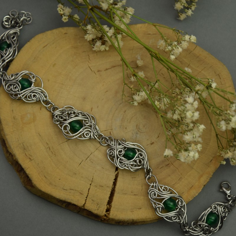 Elegancka, ręcznie robiona bransoletka z zielonym onyksem. Wykonana ręcznie techniką wire wrapping. Wzory z drutów są niepowtarzalne co czyni bransoletkę unikatową. Długość bransoletki regulowana ok.19-25cm, ale mogę zmienić jej długość.