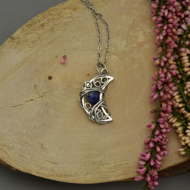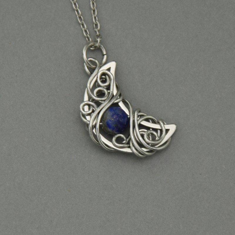 Ręcznie robiony wisiorek z półksiężycem z kulą naturalnego lapis lazuli. Zrobiony techniką wire wrapping w całości ze stali chirurgicznej. Wzór zrobiony z drutów jest niepowtarzalny.