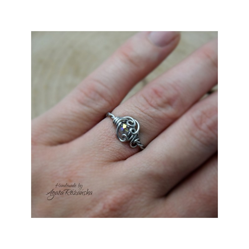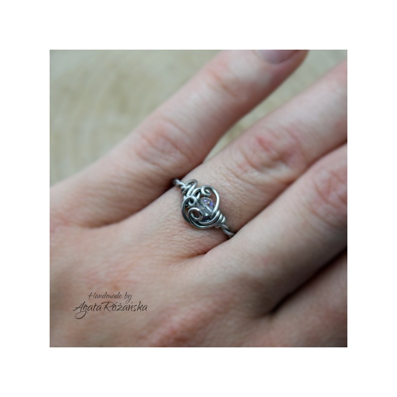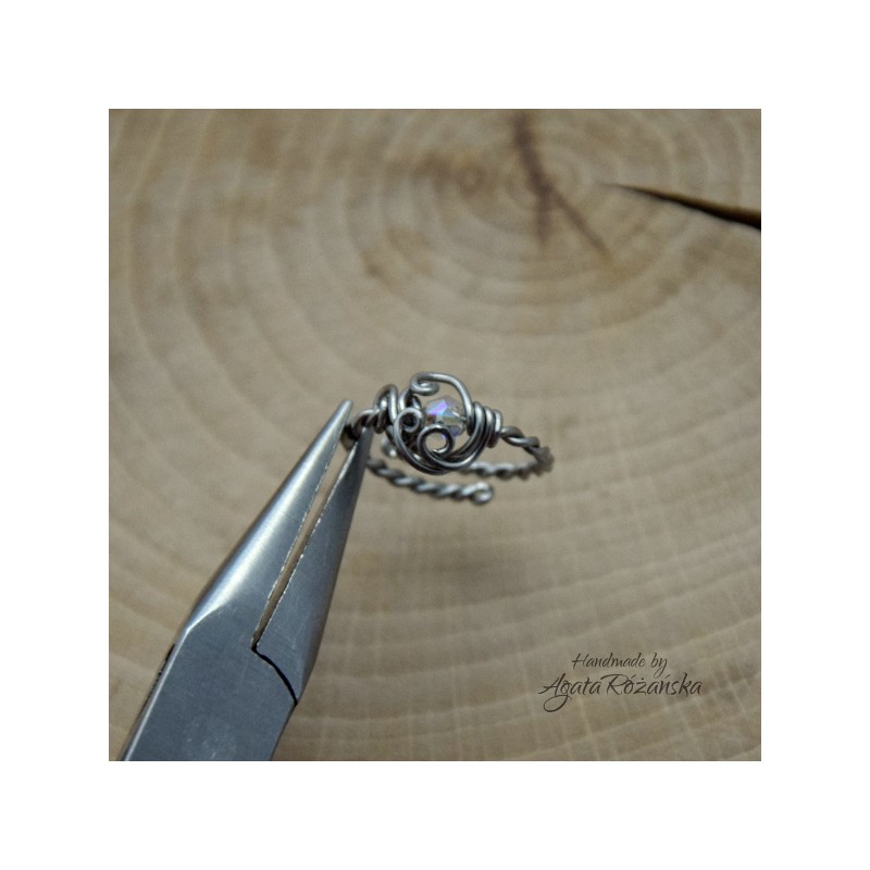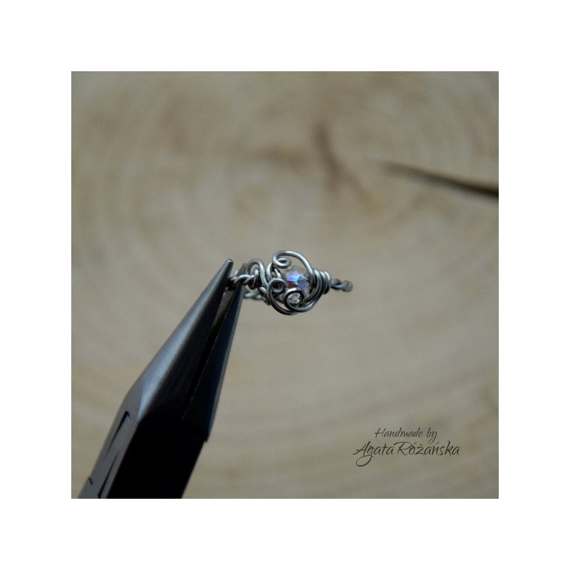 Minimalistyczny, ręcznie robiony pierścionek z kryształkiem, zrobiony techniką wire wrapping z drutów ze stali chirurgicznej.