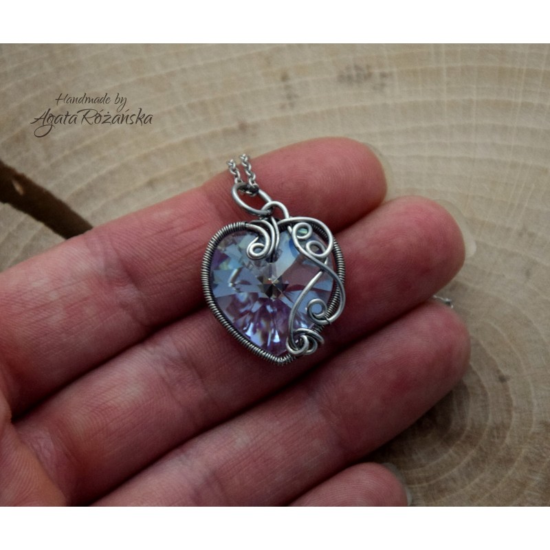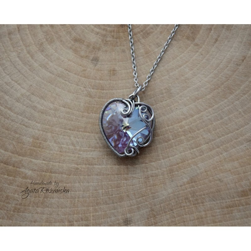 Wisiorek z sercem Swarovski Xilion Heart 18mm w kolorach delikatnego fioletu o nazwie Violet AB. Stworzony techniką wire wrapping w całości ze stali chirurgicznej. Długość całkowita wisiorka (z zawieszką) to ok. 3 cm. Zawieszony został na łańcuszku o długości ok.50 cm.