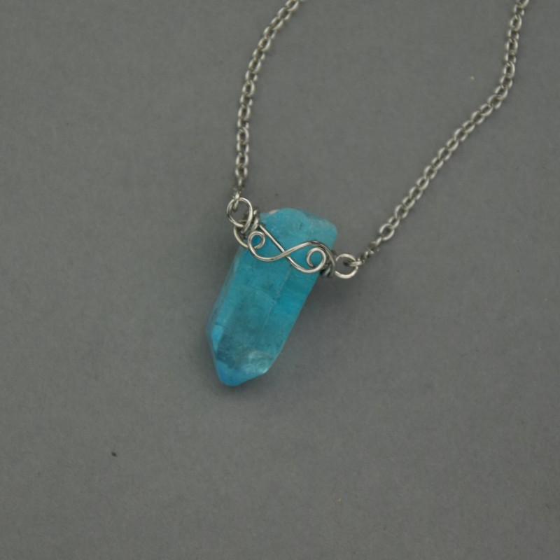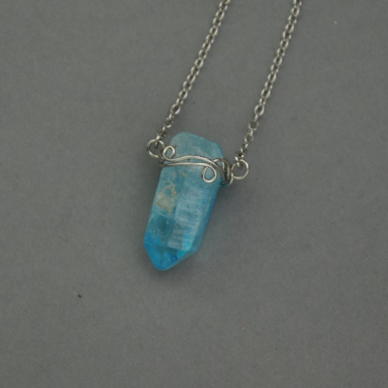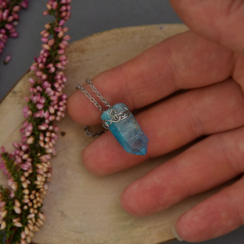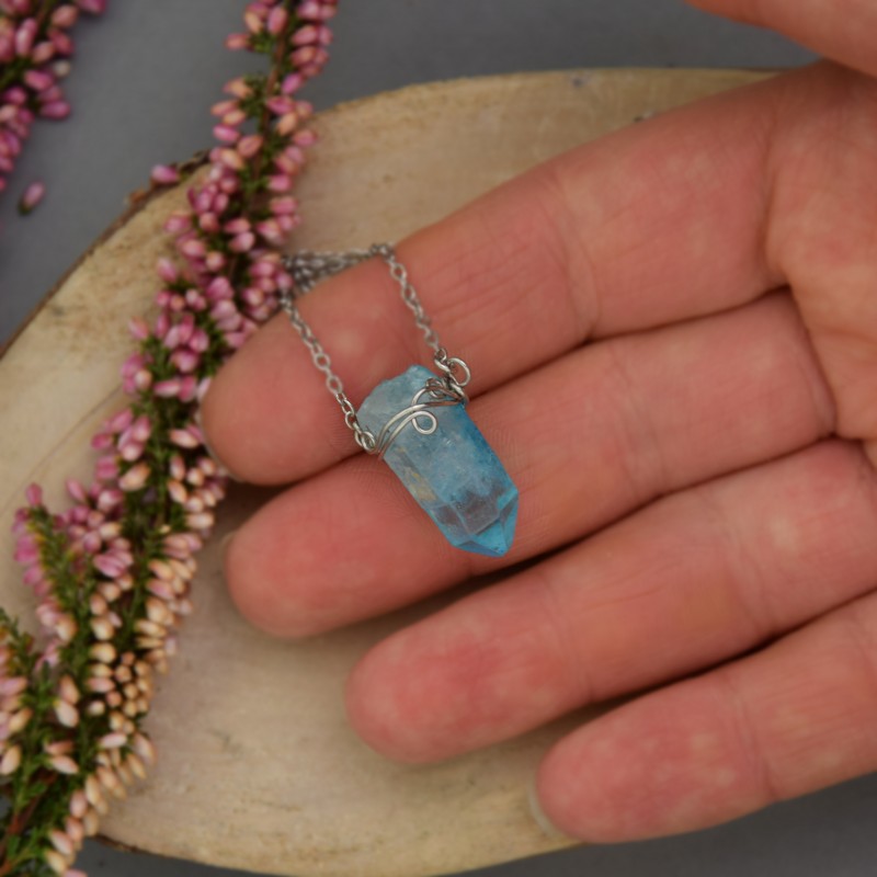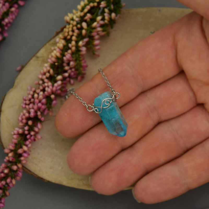 Naszyjnik z kolekcji Talizmany w wersji minimalistycznej z niebieskim kryształem górskim w formie surowego sopla z naturalnym szpicem.