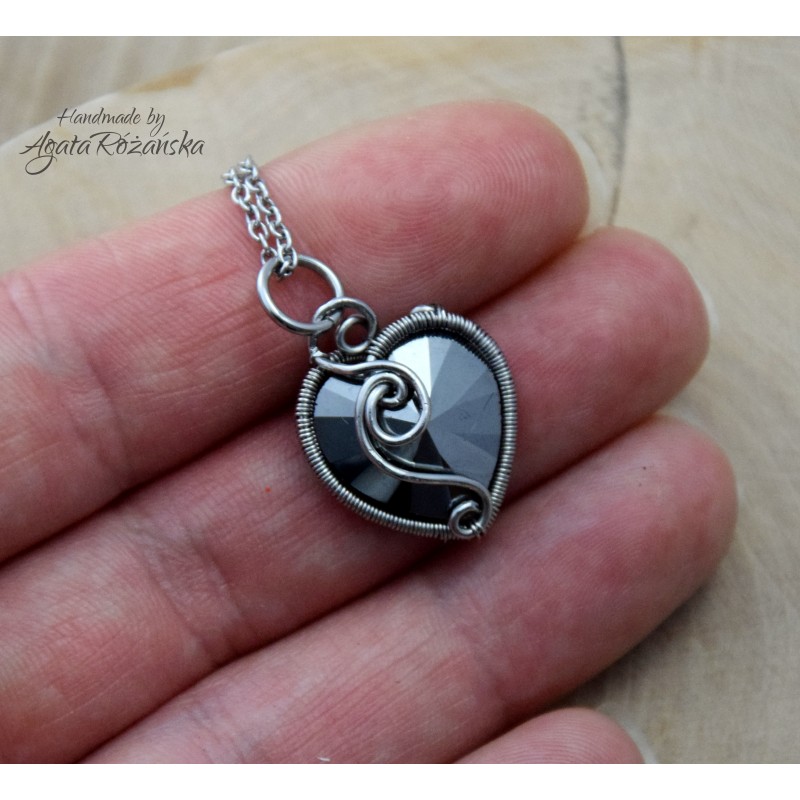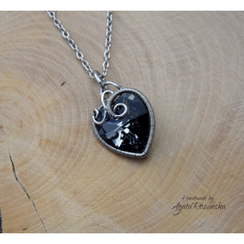 Wisiorek z wysokiej jakości kryształkiem w kształcie serca 14mm w ciemnym kolorze Silver Night. Wykonany ręcznie, techniką wire wrapping z drutów ze stali chirurgicznej.